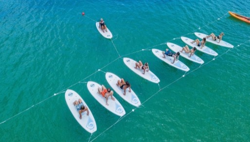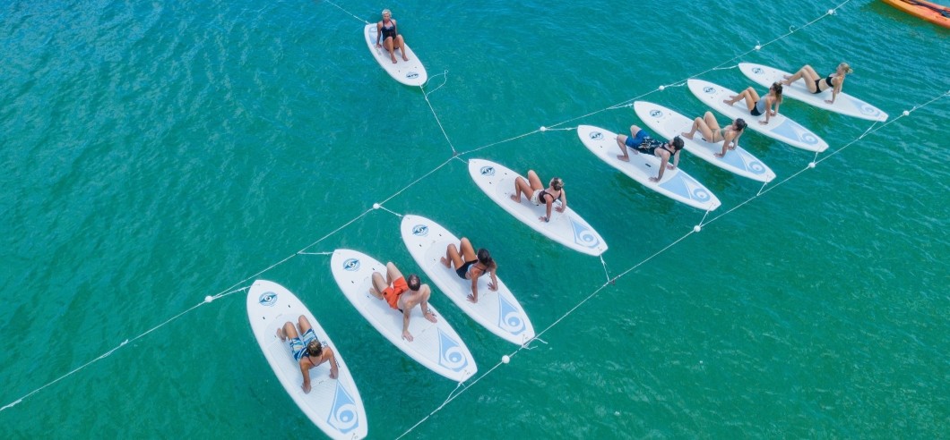 In this 90-minute class, you’ll meet your experienced teacher on the sand before taking a short paddle out to the floating studio where they’ll guide you through the poses. And don’t worry – the SUPs are linked together, so you won’t float away!